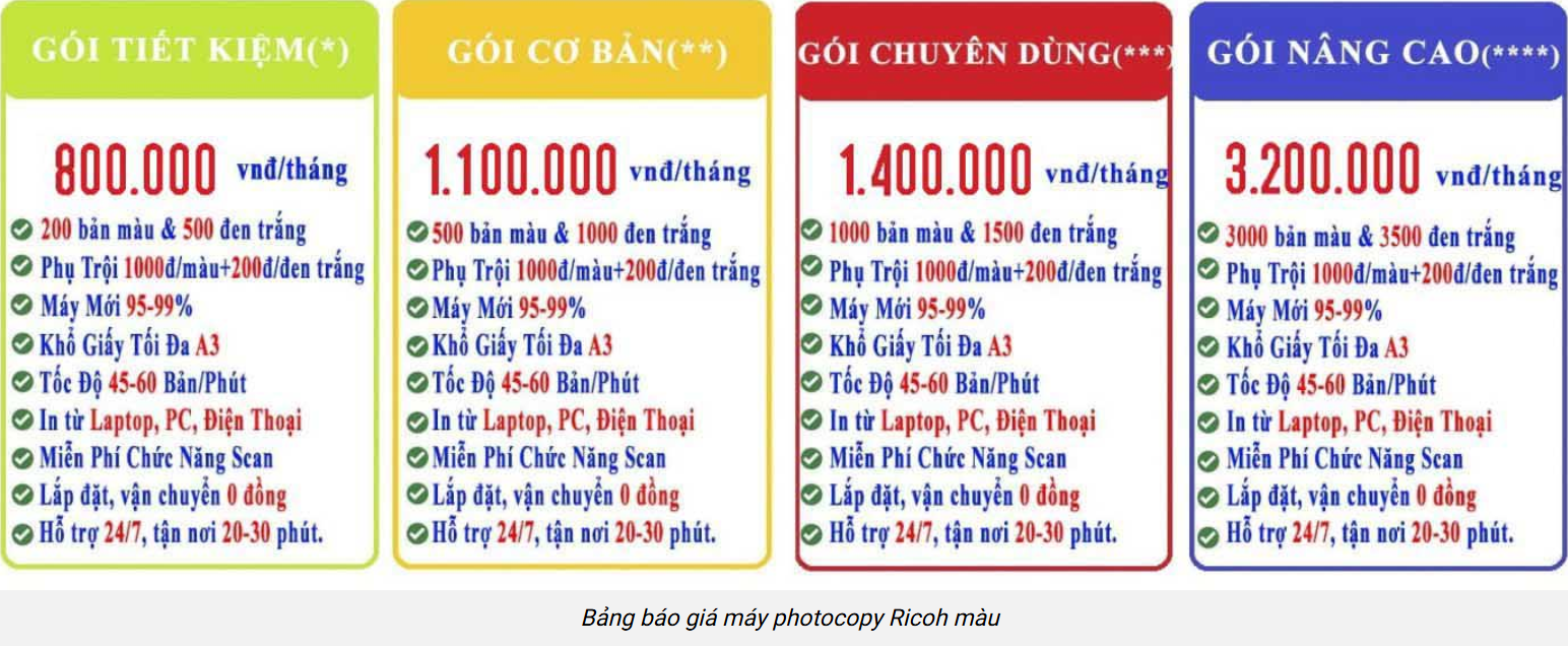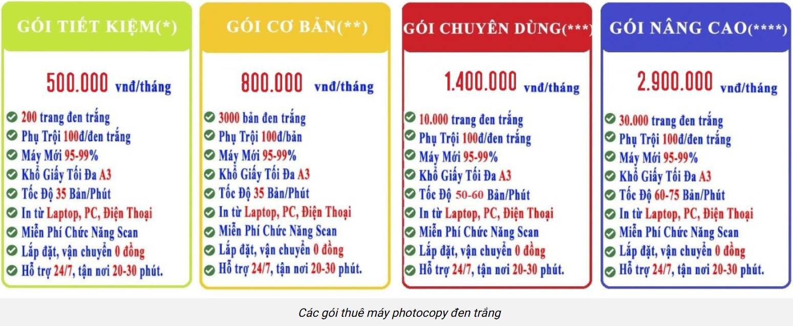 Tùy thuộc vào nhu cầu sử dụng, loại máy, số bản in mà chi phí thuê máy sẽ thay đổi, không cố định. Giá thuê máy photocopy giao động từ 500k đến 2tr đồng/tháng. Để được tư vấn kỹ hơn về vấn đề này quý khách vui lòng liên hệ Song Long thông qua hotline : 0855 569 436